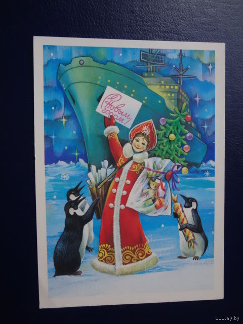 С Новым годом! 1981 г. Снегурочка, пингвины, корабль. подписанная.