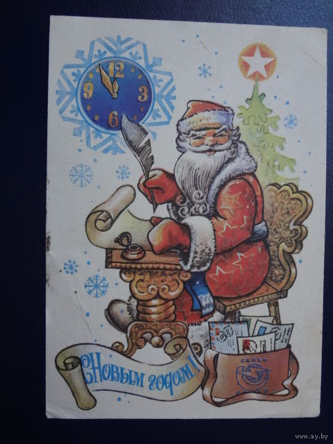 С Новым годом! 1982 г. Дед Мороз пишет письмо, часы. подписанная.