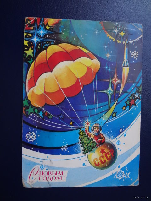 С Новым годом! 1982 г. Мальчик Новый год в спускаемом аппарате, подписанная.