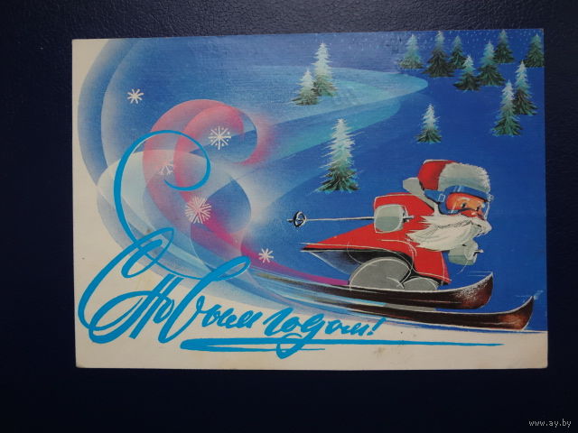 С Новым годом! 1983 г. Дед Мороз на лыжах. подписанная.