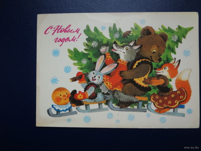 С Новым годом! 1983 г. Колобок, звери, санки. напечатано поздравление.