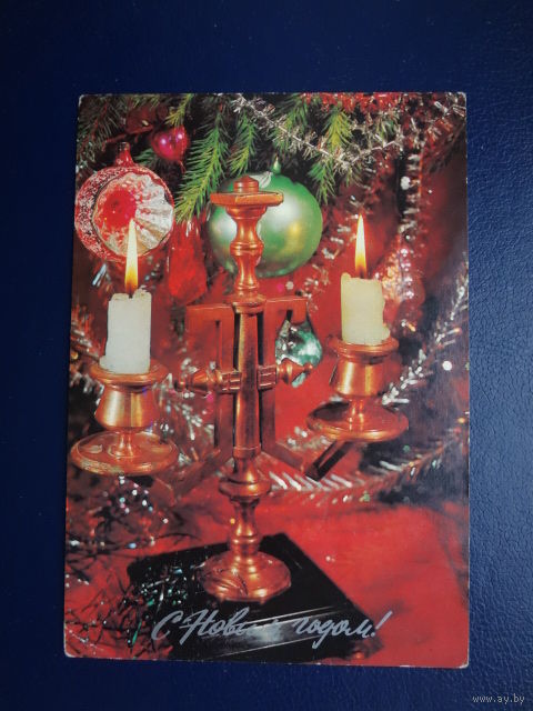 С Новым годом! 1983 г. Подсвечник, свечи, игрушки. подписанная.
