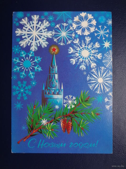 С Новым годом! 1983 г. Спасская башня, снежинки. чистая.
