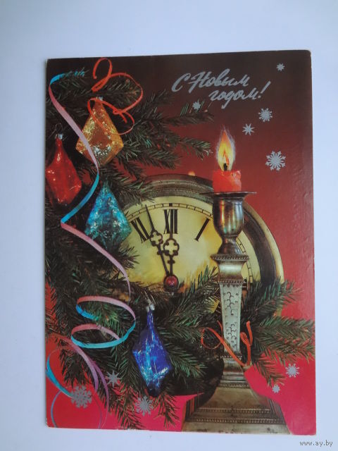 С Новым годом! 1984 г. Подсвечник, свеча, часы. подписанная.