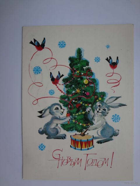 С Новым годом! 1984 г. Ёлка, зайцы, барабан, снегири. подписанная.