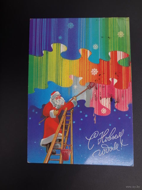 С Новым годом! 1985 г. Дед Мороз, лестница, кисть. подписанная.