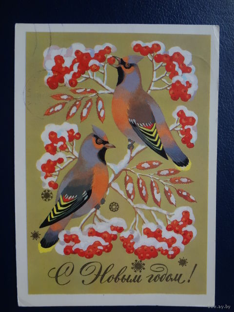 С Новым годом! 1986 г. Свиристели, рябина. подписанная.