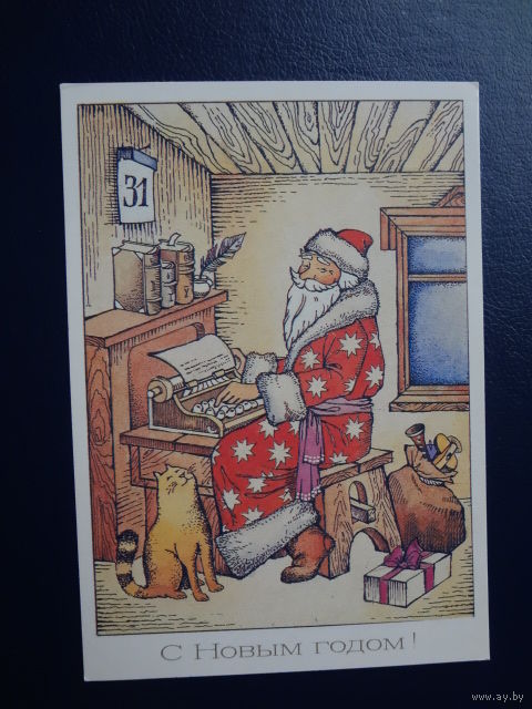 С Новым годом! 1987 г. Дед Мороз печатает поздравление. чистая.