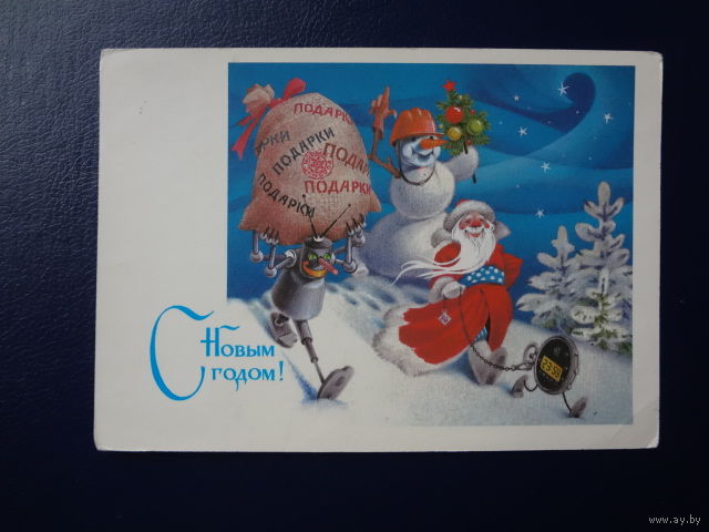С Новым годом! 1987 г. Дед Мороз, снеговик, робот, подарки. чистая.