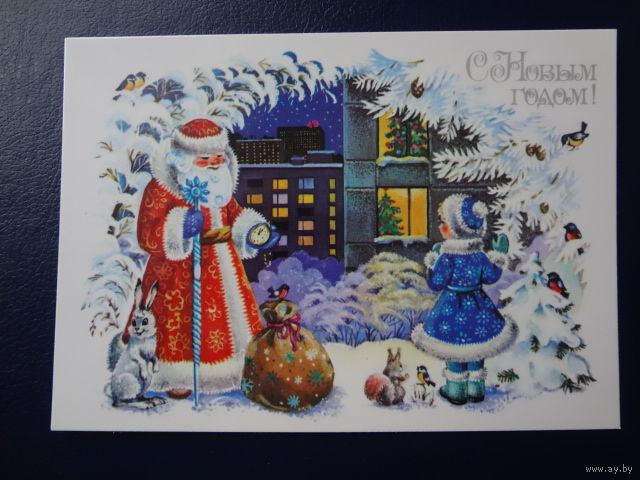 С Новым годом! 1987 г. Дед Мороз, Снегурочка, мешок, дома. чистая.