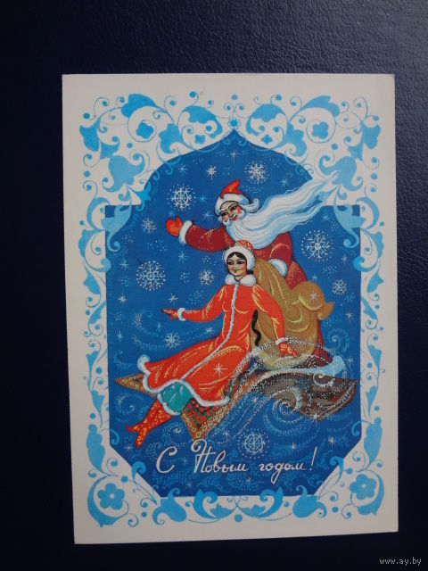 С Новым годом! 1987 г. Дед Мороз, Снегурочка на ковре-самолете. подписанная.