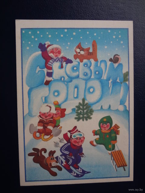 С Новым годом! 1987 г. Дети, горка, санки, лыжи. подписанная.