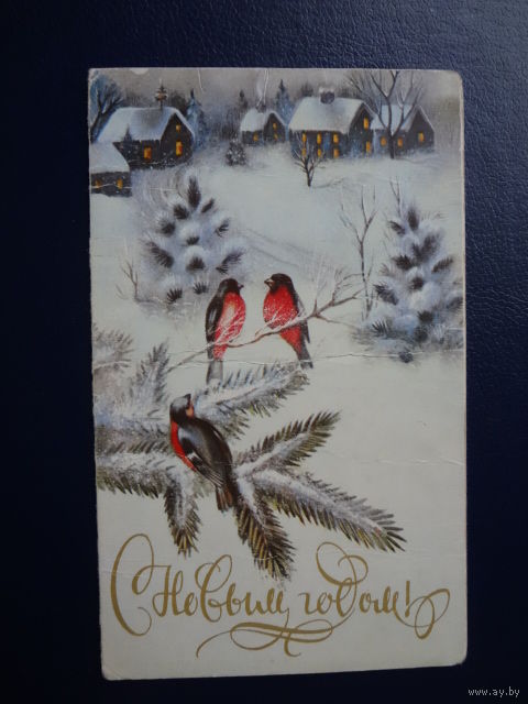 С Новым годом! 1987 г. Дома, снегири. двойная, подписанная.