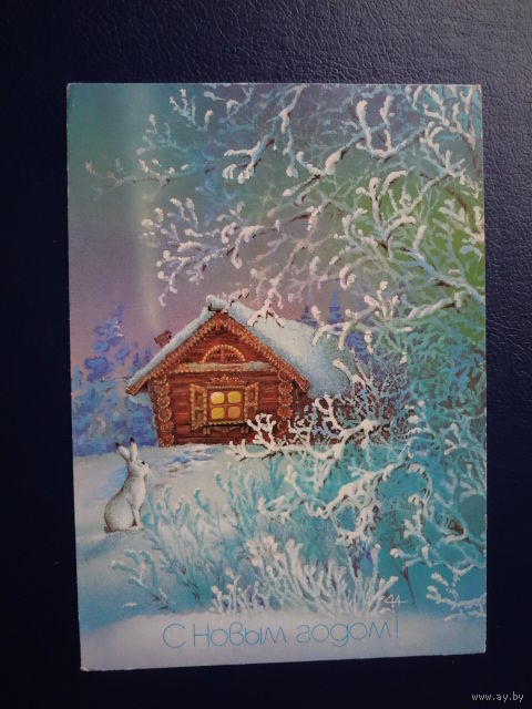 С Новым годом! 1987 г. Избушка, дым, заяц. подписанная.