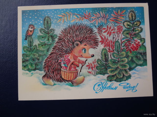 С Новым годом! 1987 г. Ёжик с корзинкой, ёлочки. подписанная.