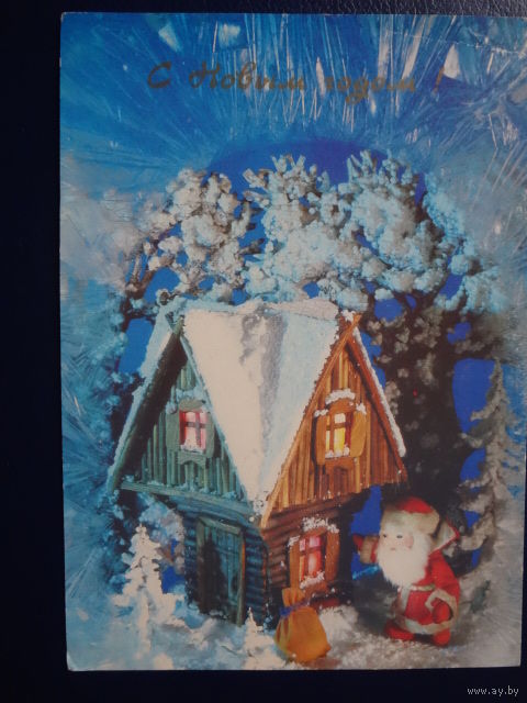 С Новым годом! 1991 г. Домик, Дед Мороз, мешок. подписанная.
