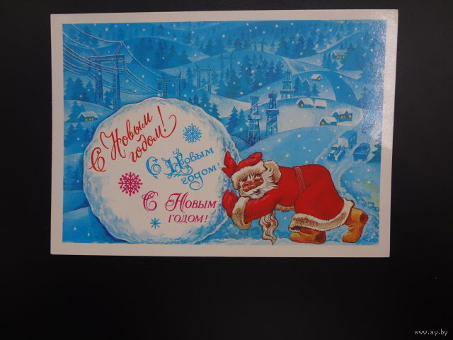С Новым годом! (три раза). 1985 г. Дед Мороз, снежный ком. подписанная.