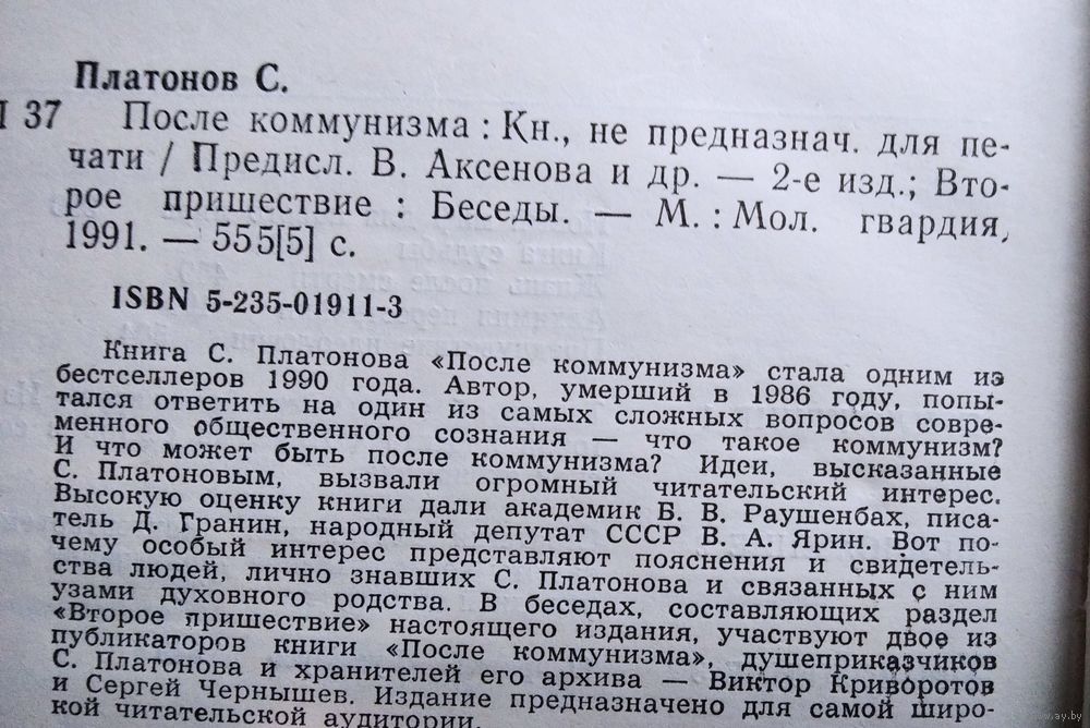 Книга `После коммунизма` стала одним из бестселлеров 1990 года. Подзаголовок этой книги говорит сам за себя: она действительно писалась не для публикации. Однако трагический поворот в судьбе автора, умершего в 1986 году, открыл возможность для ознакомления с его идеями, которые, может быть, опередили свое время. Автор попытался ответить на один из самых сложных вопросов современного общественного сознания — что такое коммунизм? И что может быть после коммунизма? В самом деле, что может быть после коммунизма? Высокую оценку книги дали академик Б.В.Раушенбах, писатель Д.Гранин. Вот почему особый интерес представляют пояснения и свидетельства людей, лично знавших С.Платонова и связанных с ним узами духовного родства. В беседах, составляющих раздел `Второе пришествие` настоящего издания, участвуют двое из публикаторов книги `После коммунизма`, душеприказчиков и хранителей архива писателя — Виктор Криворотов и Сергей Чернышев.