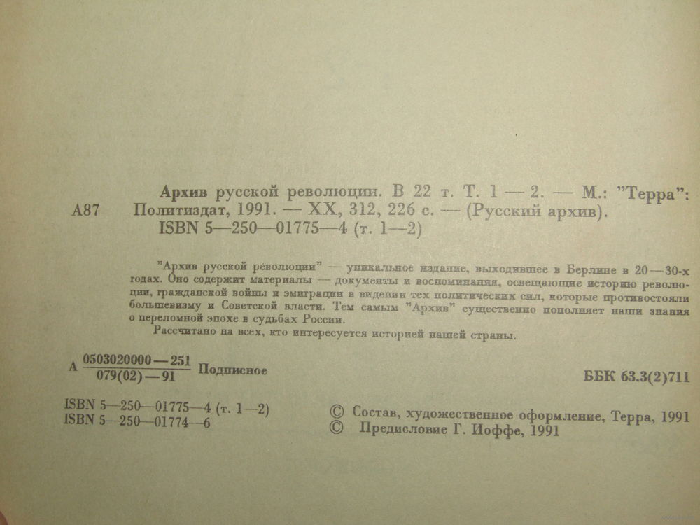 «Архив русской революции» - уникальное издание, выходившее в Берлине в 20-30-х годах. Оно содержит материалы - документы и воспоминания, освещающие историю революции, гражданской войны и эмиграции в видении тех политических сил, которые противостояли большевизму и Советской власти. Тем самым «Архив» существенно пополняет наши знания о переломной эпохе в судьбах России. СОДЕРЖАНИЕ отд. томов. Том I: Читая `Архив русской революции` – Задачи Архива – Набоков В. Временное Правительство – Краснов П. На внутреннем фронте – Донской Р. От Москвы до Берлина в 1920 г. – Воронов С. Петроград – Вятка в 1919-1920 гг. – Неклюдов Н. Предсказание русской революции – ДОКУМЕНТЫ И ПИСЬМА: Крамарж К. Основы Конституции Рос. Гос-ва – Доклад о положении дел на Украине в Марте 1918 г. – Образование северо-западного правительства – ИЗ ЧАСТНОЙ ПЕРЕПИСКИ: Последние дни Леонида Андреева – Описание польского отступления в Августе 1920 г. Том II: Из истории Манифеста 17-го Октября – Из воспоминаний А.С. Лукомского – Дроздов А. Интеллигенция на Дону – Гуль Р. Киевская эпопея – Штейнман Ф. Отступление от Одессы – Рапопорт И. Полтора года в советском Главке – Чернина О. Брест-Литовск – ДОКУМЕНТЫ И ПИСЬМА: Ж-л Заседания Сов. Мин. Крымского Краевого Прав-ва 16 Апр. 1919 г. – Из секретного доклада – Милицын С.В. Из моей тетради – фон-Лорингофен Ф. Из Дневника. … Том XI: Завадский С.В. На великом изломе – Могилянский Н.Н. Трагедия Украины – Краснов В.М. Из воспоминаний о 1917-1920 гг. – ДОКУМЕНТЫ: Кельсиев В.И.. …