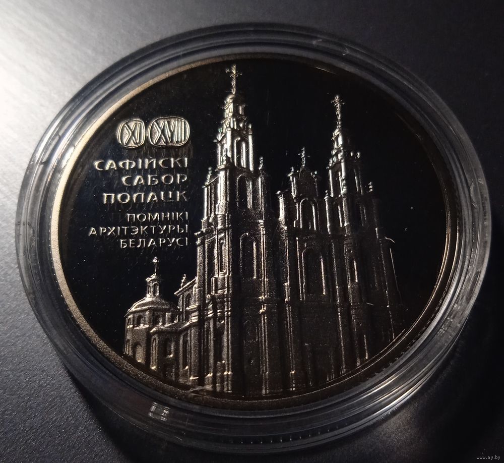 в центре – рельефное изображение Софийского собора в Полоцке; слева – изображение печатей с датами: ХI, ХVIII века и надписи: САФІЙСКІ САБОР, ПОЛАЦК, ПОМНІКІ АРХІТЭКТУРЫ БЕЛАРУСІ.
