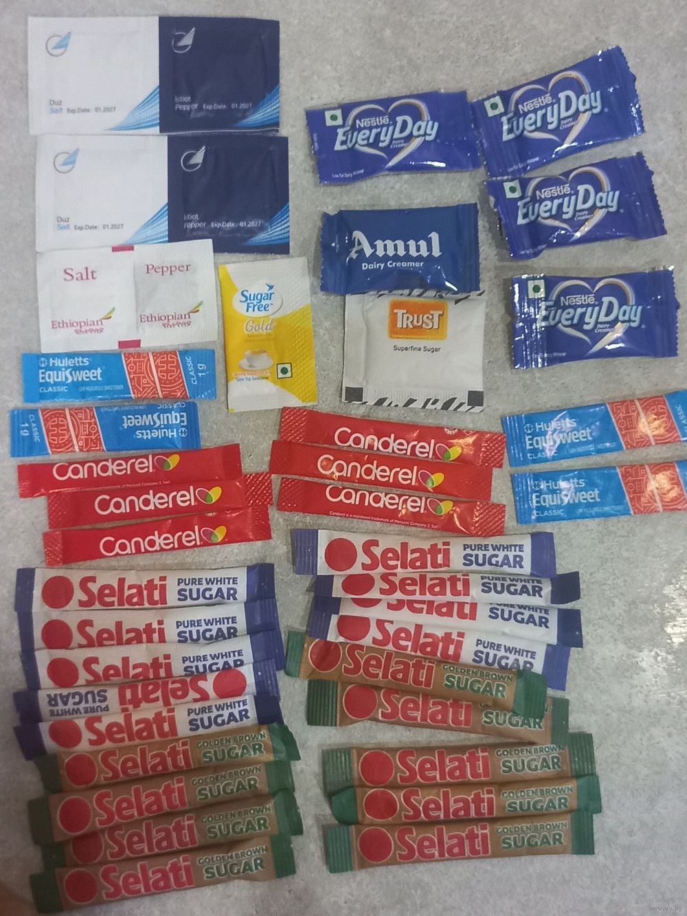 Сахар, сахарозаменитель, перец, соль, сливки в пакетиках.