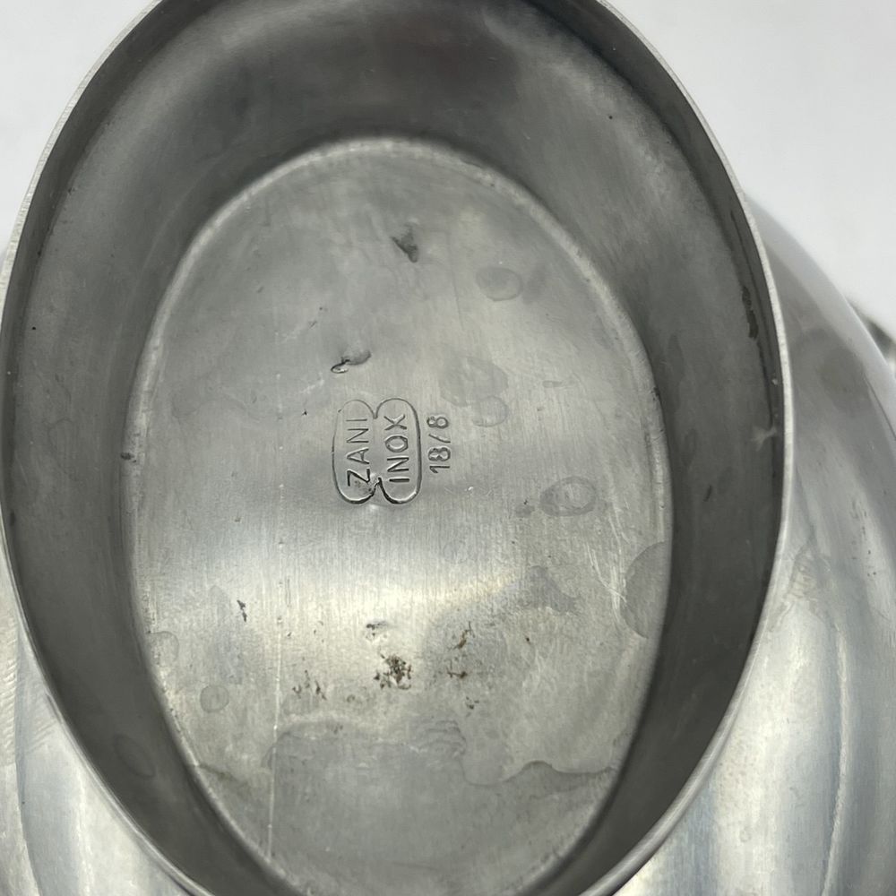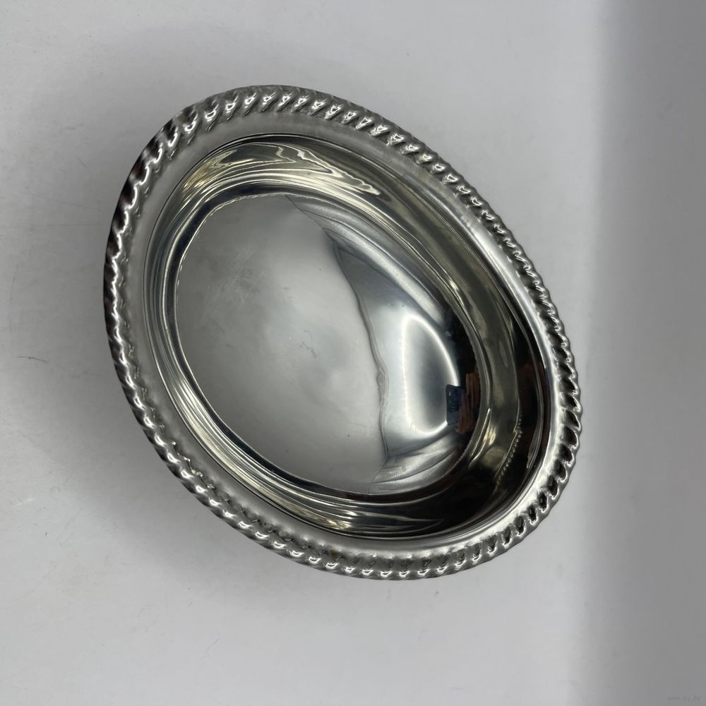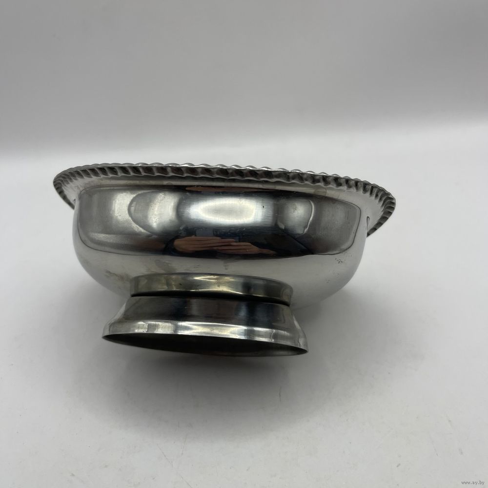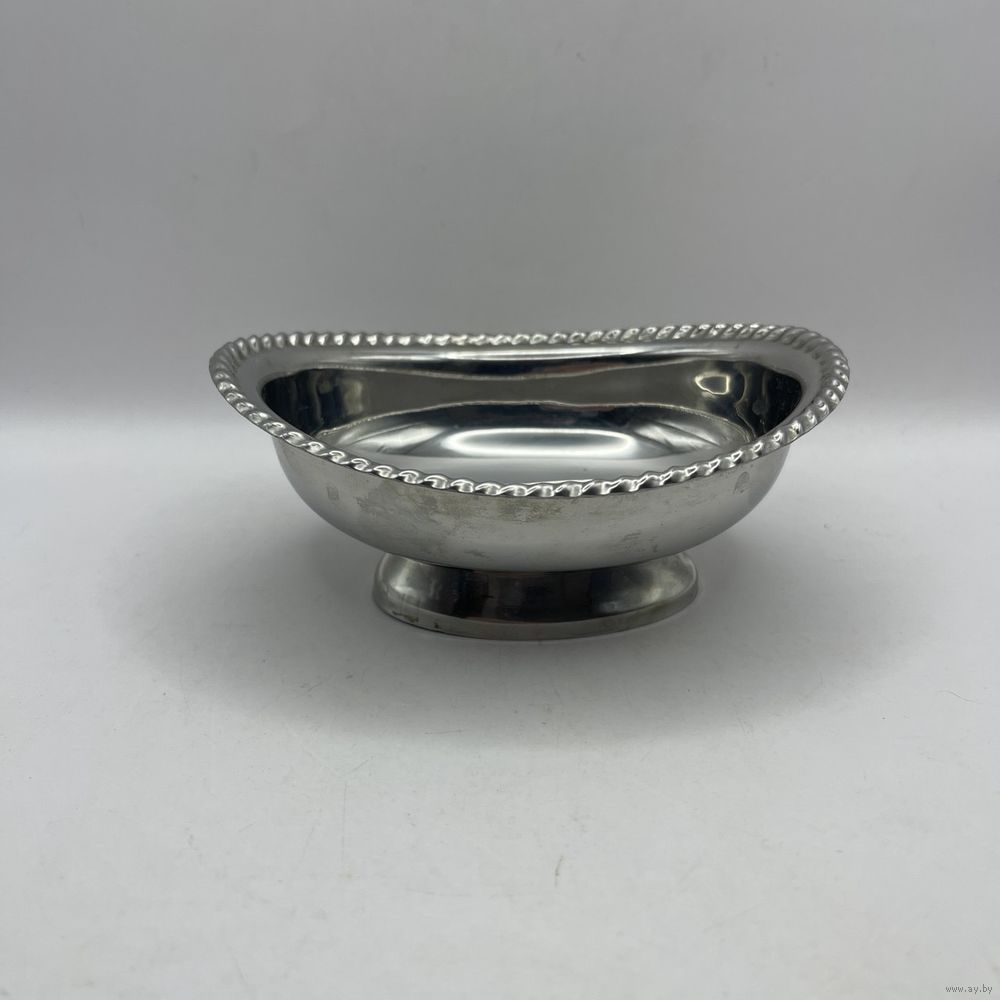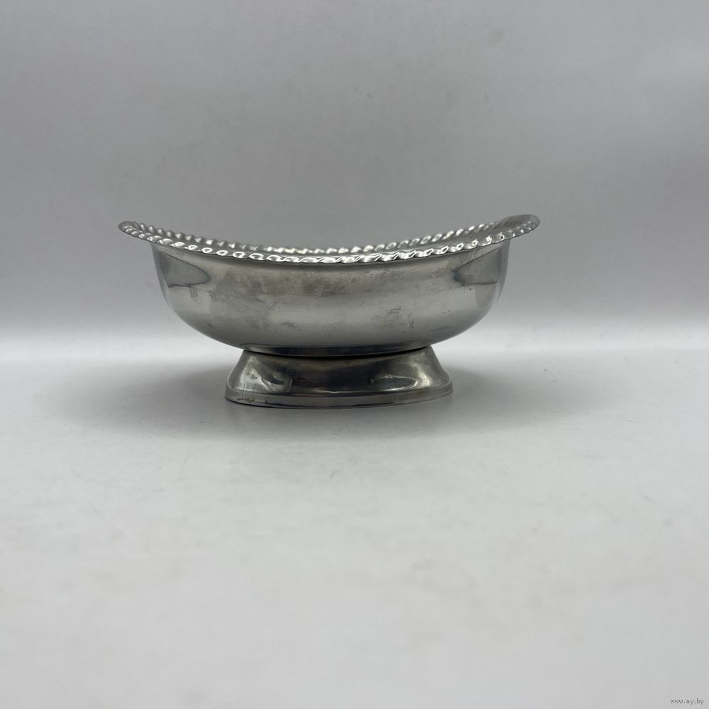Винтажная икорница на ножке, сервировочная тарелочка из нержавеющей стали. Рельефный декор по краю. Италия. Клеймо. 1970-е г.г. Размер 13 х 10 х 5 см. Можно использовать в качестве конфетницы, сахарницы, для подачи оливок, орешков и т.д. Естественная патина.