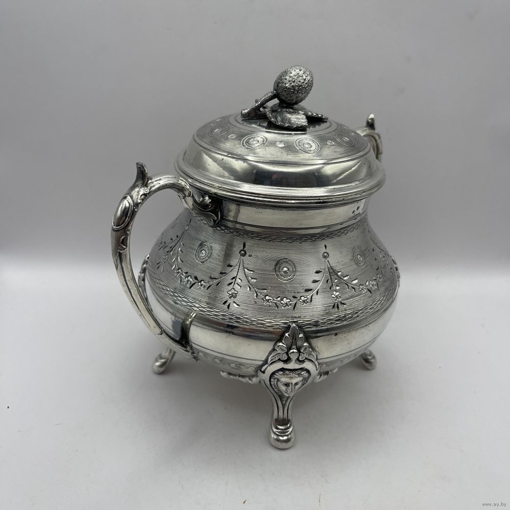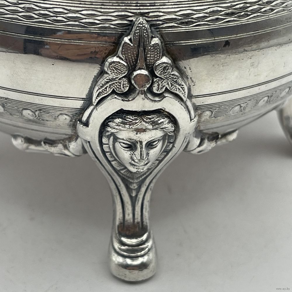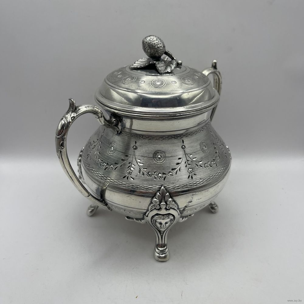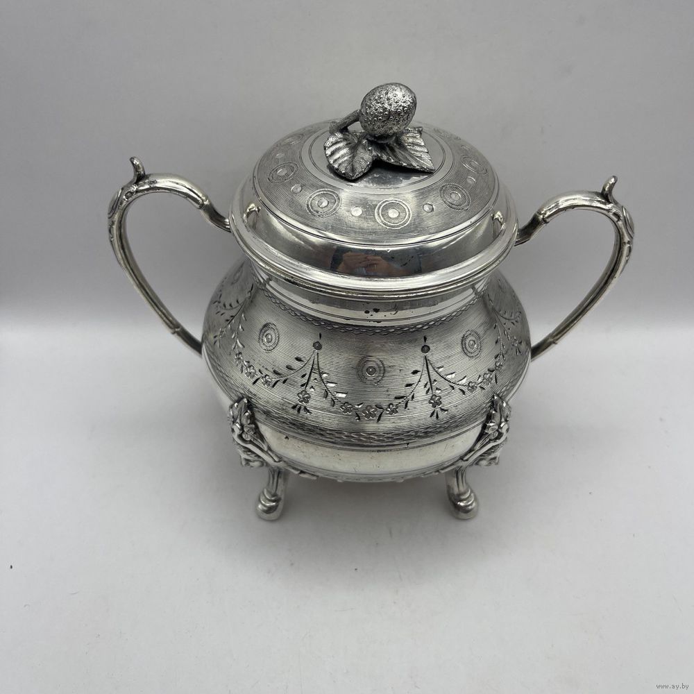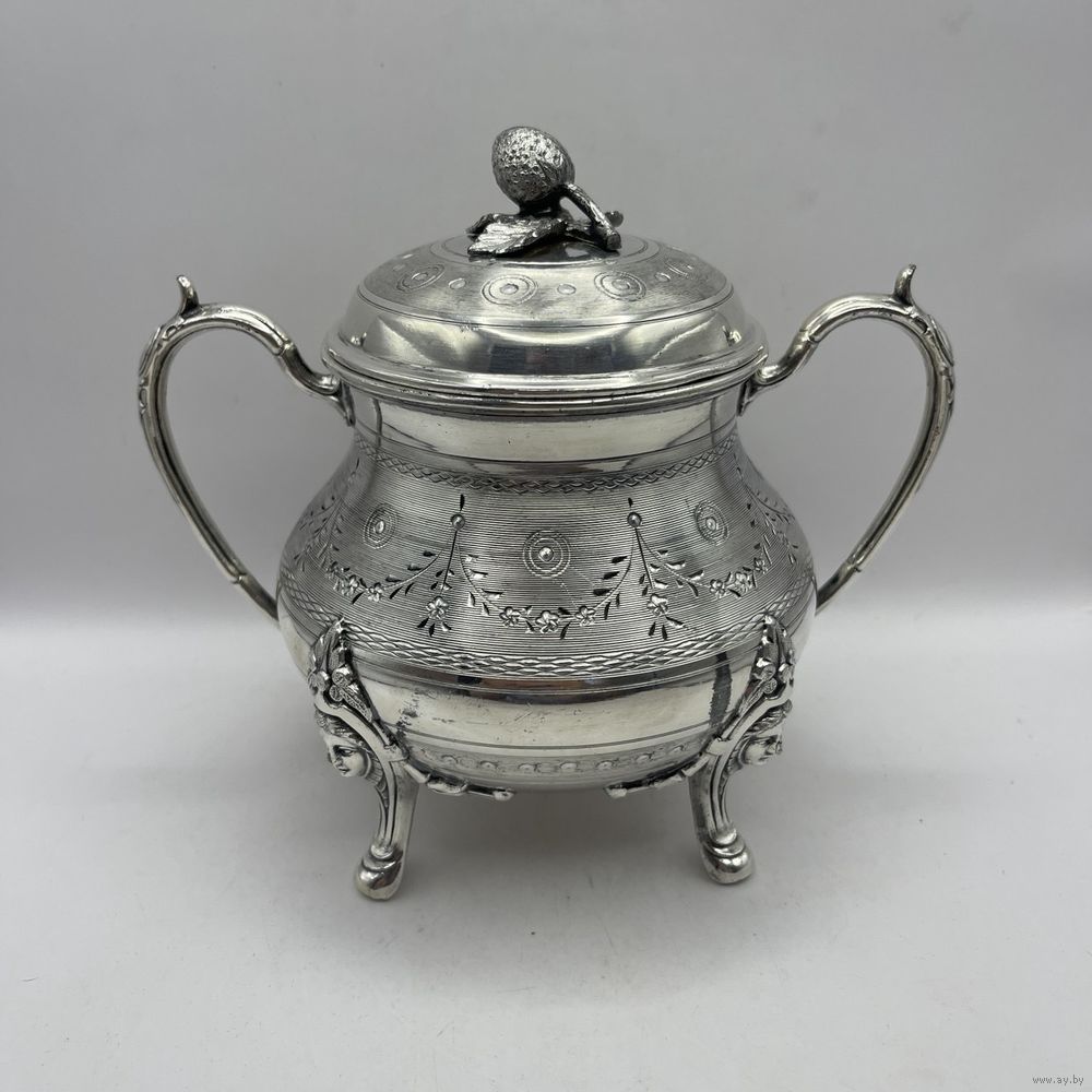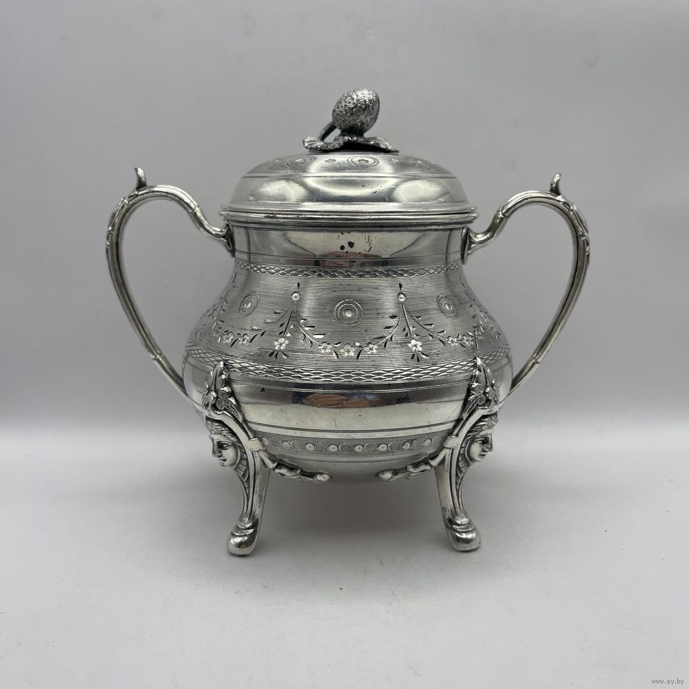 Антикварная сахарница SHEFFIELD из металла с глубоким серебрением. На лапах с объемным изображением ликов мифологических богинь. С цветочными гирляндами ручной штихтельной гравировки и ручкой в виде объемной ягоды клубники. Англия. 1920-е г.г. Клеймо. Размер 19 х 16 см, объем 700 мл. Естественная патина, следы бытования внутри. Незначительные вмятинки на дне, на внешний вид не влияют (см. фото).