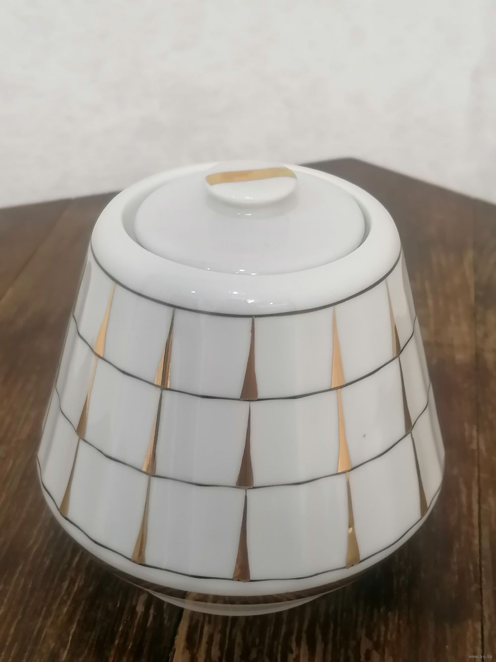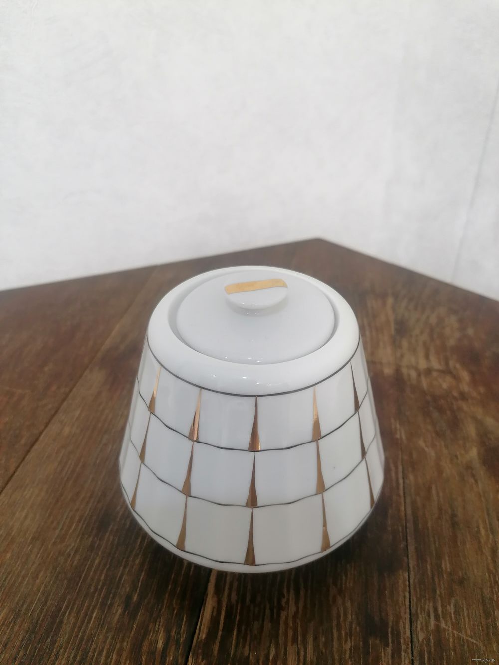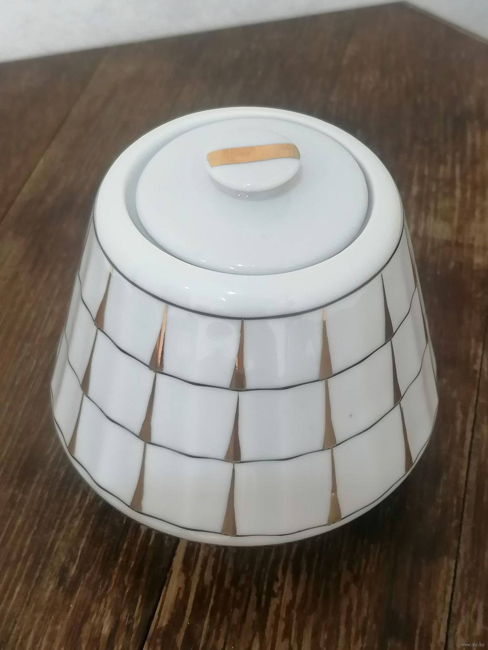 В хорошем состоянии. На крышке сахарницы снизу пластинчатый скол.
