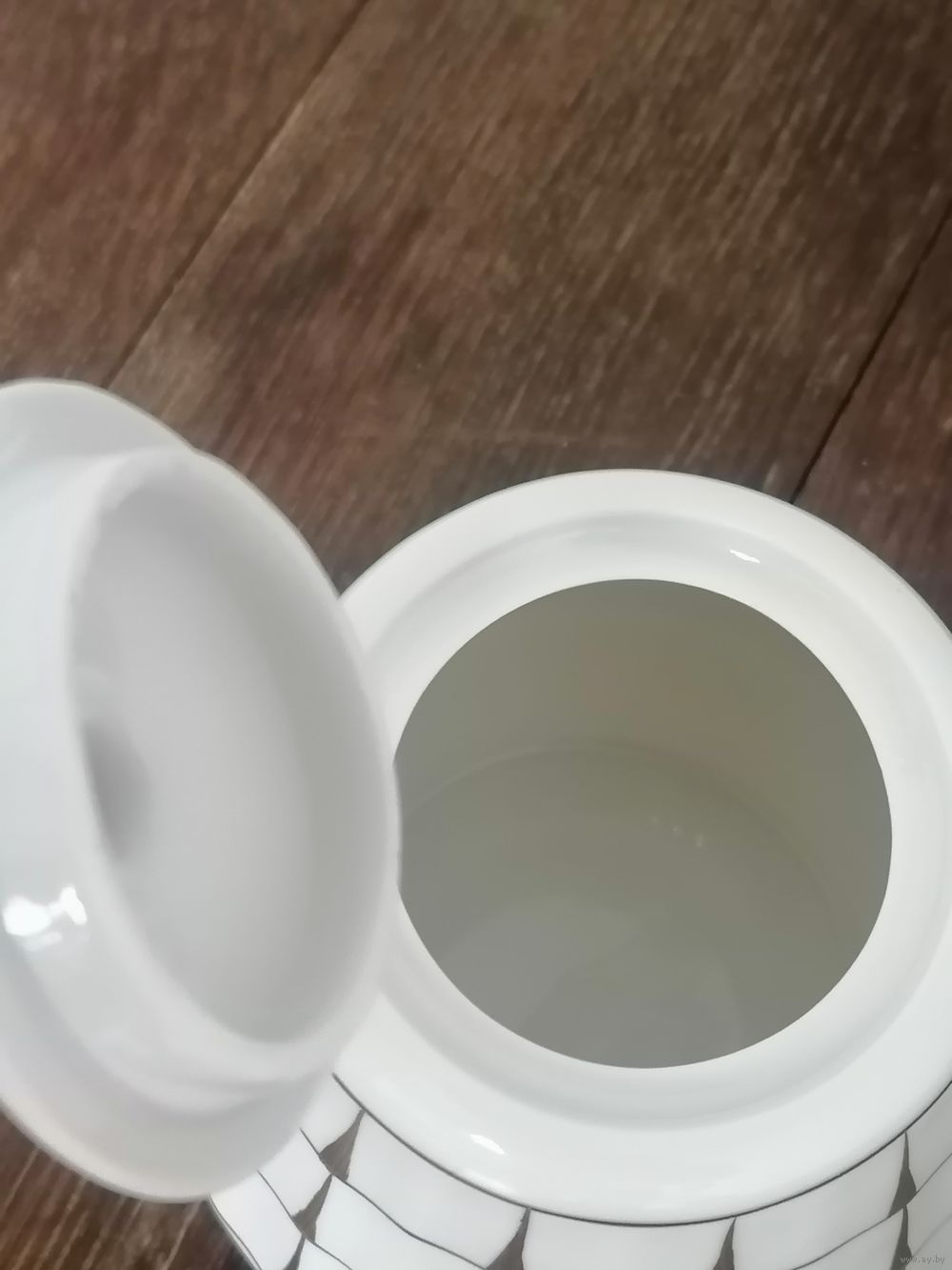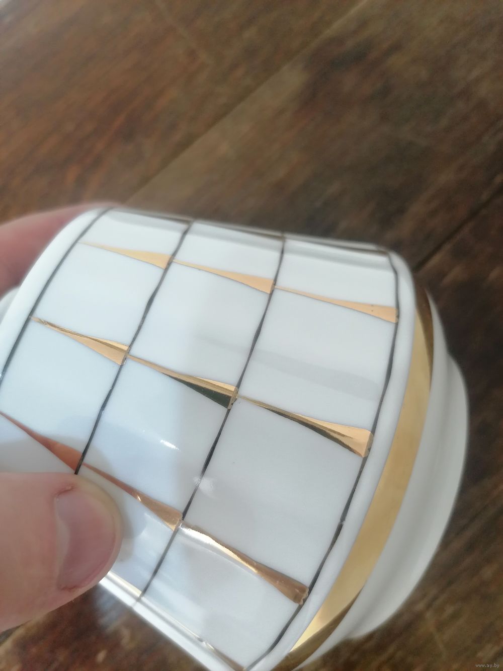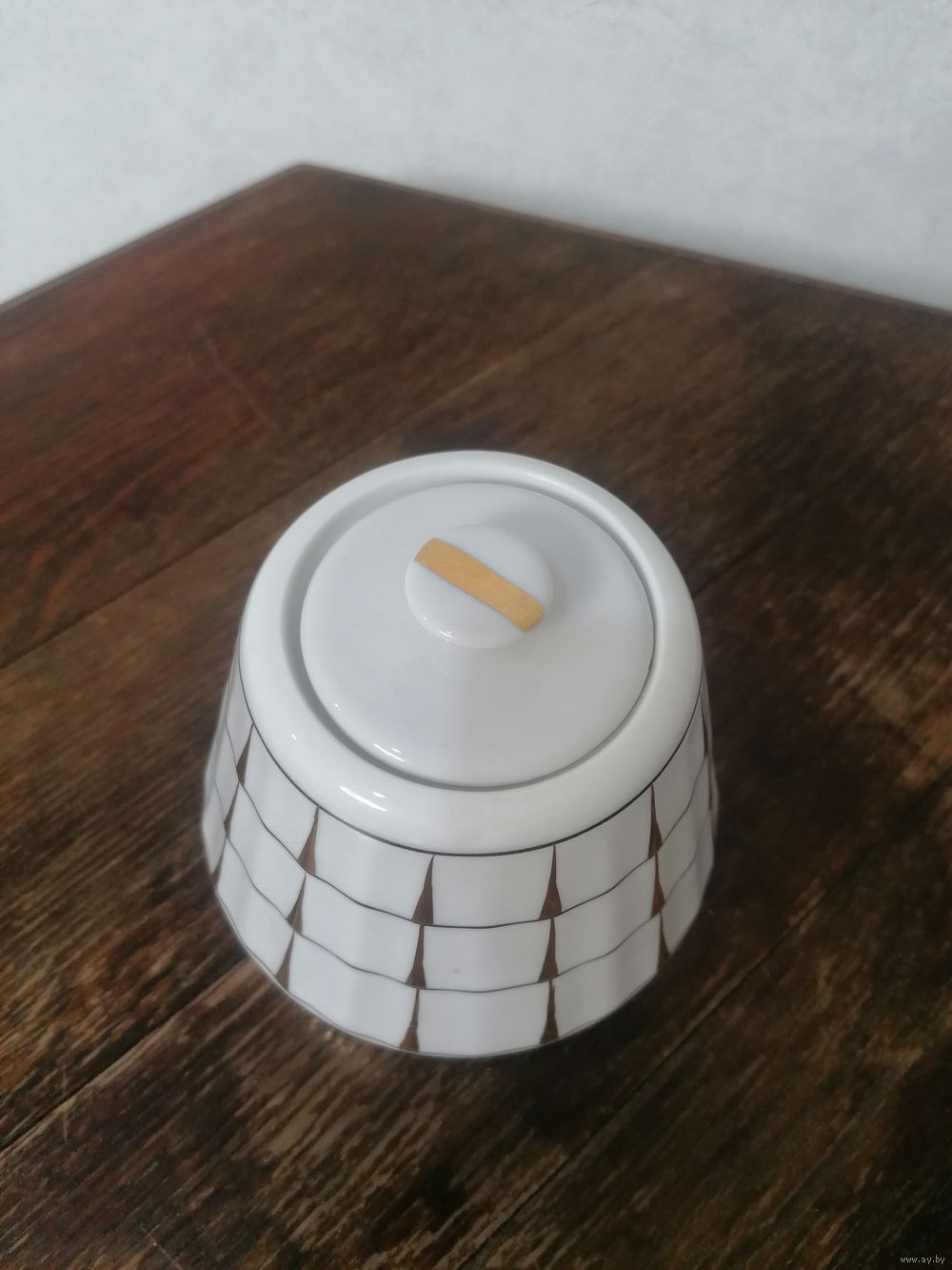 В хорошем состоянии. На крышке сахарницы снизу пластинчатый скол.