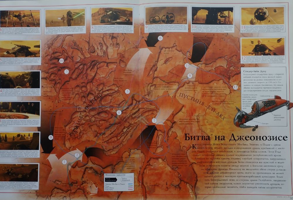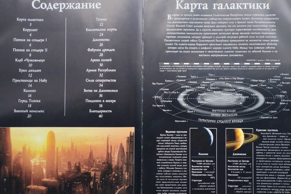 Передвижения войск и тактику в битве на Джеонозисе • Перемещения героев на зловещей фабрике по производству дроидов • Все столкновения и смертельно опасные прыжки в погоне на аэроспидерах на Корусанте Изучите Тренировочный военный комплекс, где рождаются, вырастают и обучаются солдаты-клоны • Секреты Храма джедаев • Арену, где должны были казнить Энакина, Оби-Вана и Падме Посетите Ночной клуб "Чужеземец" на Корусанте • Загадочный ангар графа Луку на Джеонозисе -• Столицу Камино, выстроенный на сваях город Типока • Космические порты в разных уголках галактики • И многое другое!