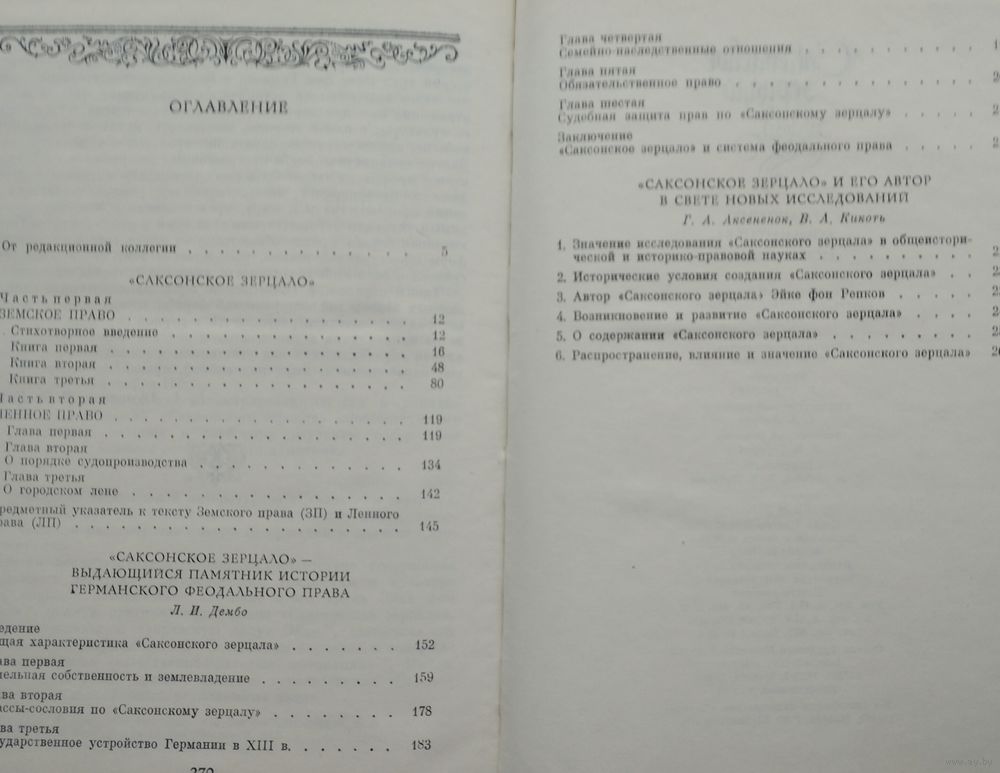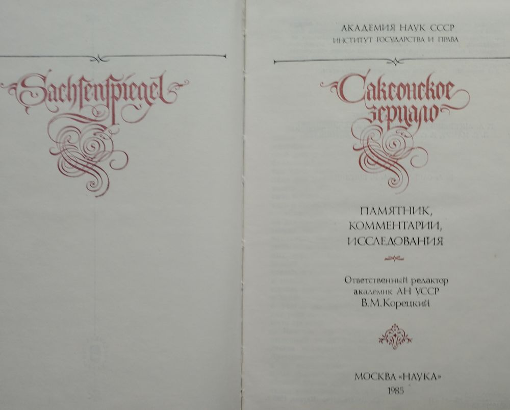 Большой формат. Тираж 5000 экз. 272 стр. Издание содержит первую публикацию на русском языке полного текста одного из крупнейших памятников права средневековой Европы. Публикация снабжена обстоятельным историко-юридическим исследованием, раскрывающим социальную природу и характерные особенности данного памятника права. Показано влияние «Саксонского зерцала» на эволюцию феодальной правовой системы, проведен анализ литературы.