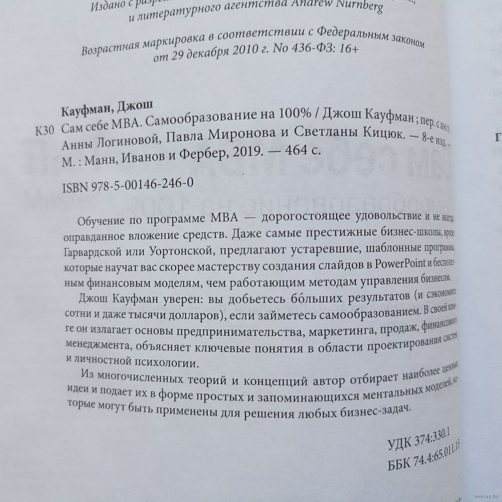 Обучение по программе MBA — дорогостоящее удовольствие и не всегда оправданное вложение средств. Даже самые престижные бизнес-школы, вроде Гарвардской или Уортонской, предлагают устаревшие, шаблонные программы, которые научат вас скорее мастерству создания слайдов в PowerPoint и бесполезным финансовым моделям, чем работающим методам управления бизнесом. Джош Кауфман уверен: вы добьетесь бoльших результатов (и сэкономите сотни и даже тысячи долларов), если займетесь самообразованием. В своей книге он излагает основы предпринимательства, маркетинга, продаж, финансового менеджмента, объясняет ключевые понятия в области проектирования систем и личностной психологии. Из многочисленных теорий и концепций автор отбирает наиболее ценные идеи и подает их в форме простых и запоминающихся ментальных моделей, которые могут быть применены для решения любых бизнес-задач.