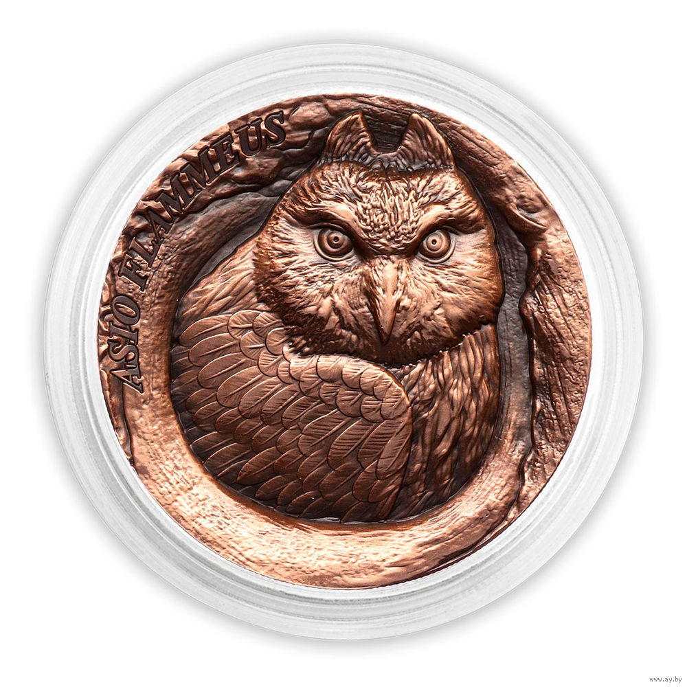 Реверс: В центре изображена Болотная сова - птица семейства совиных. Слева полукругом отчеканено название вида на латинском языке: "ASIO FLAMEUS".