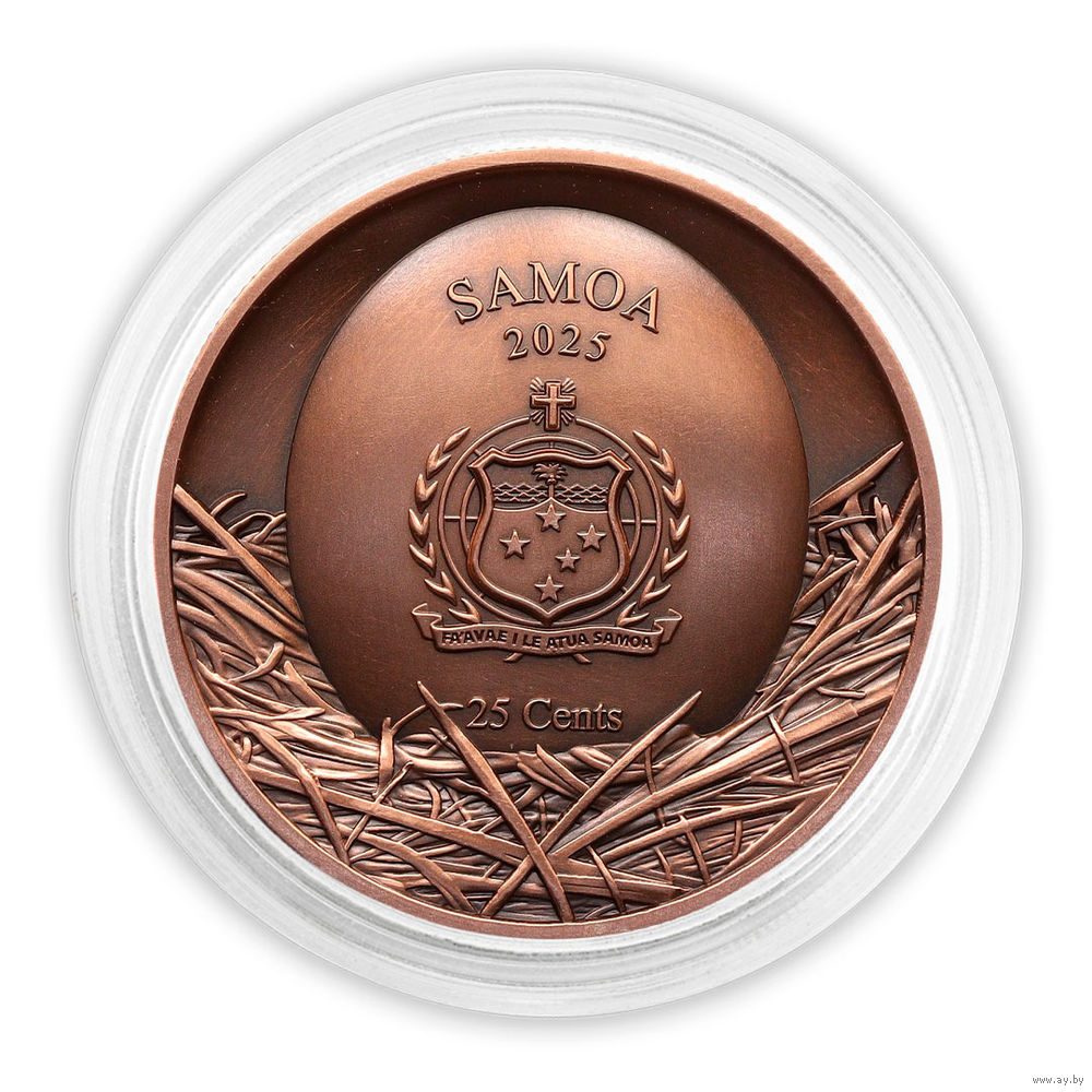 Аверс: В центре изображено яйцо, лежащее в гнезде, в центре которого расположен герб Самоа. Полукругом вверху в две строки отчеканено название страны-эмитента и год выпуска: "SAMOA / 2025", внизу под гербом - номинал "25 Cents".