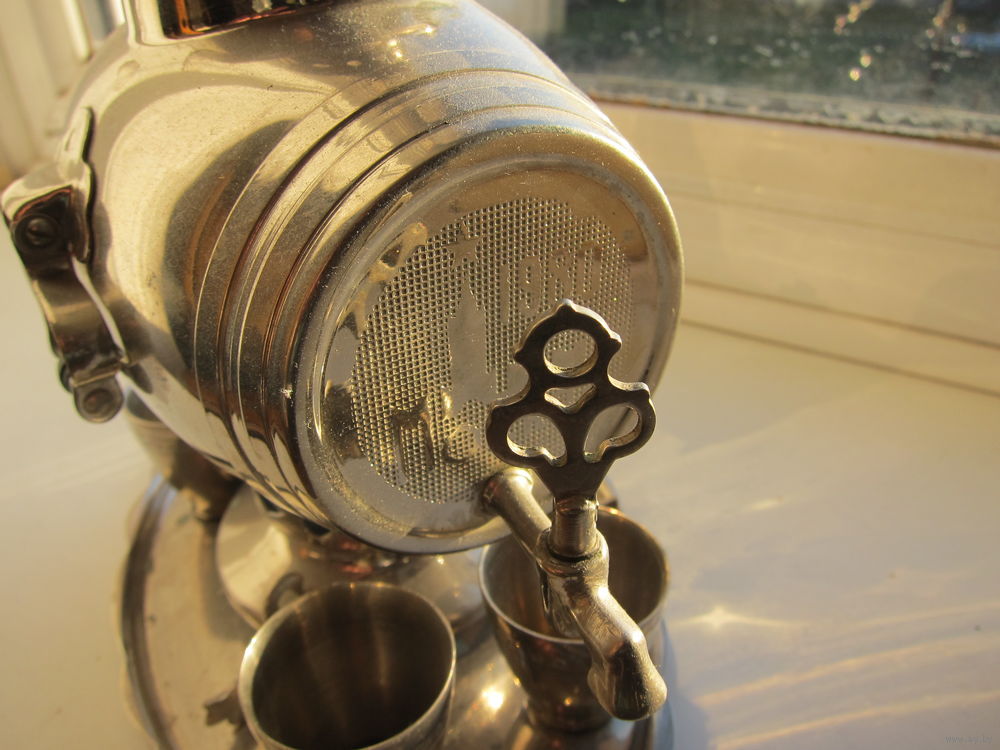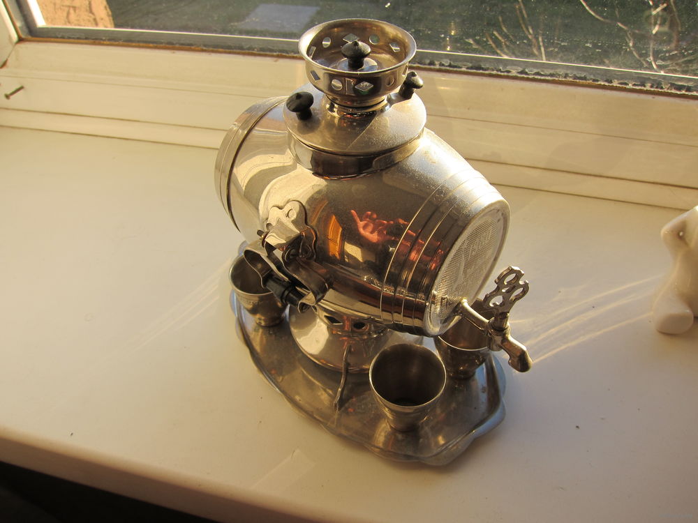 Бочонок выполнен как уменьшенная копия подлинного самовара (из латуни с внутренним лужением).