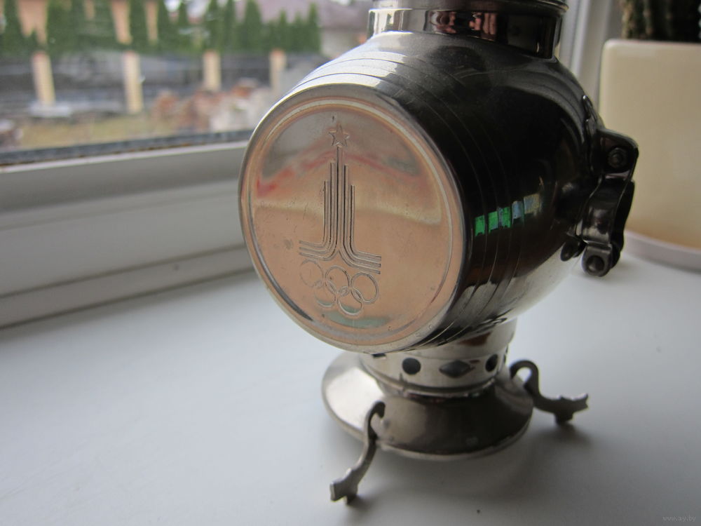 Сувенирный комплект: Сувенирный самовар бочка. Москва - 80, три стопки и поднос.