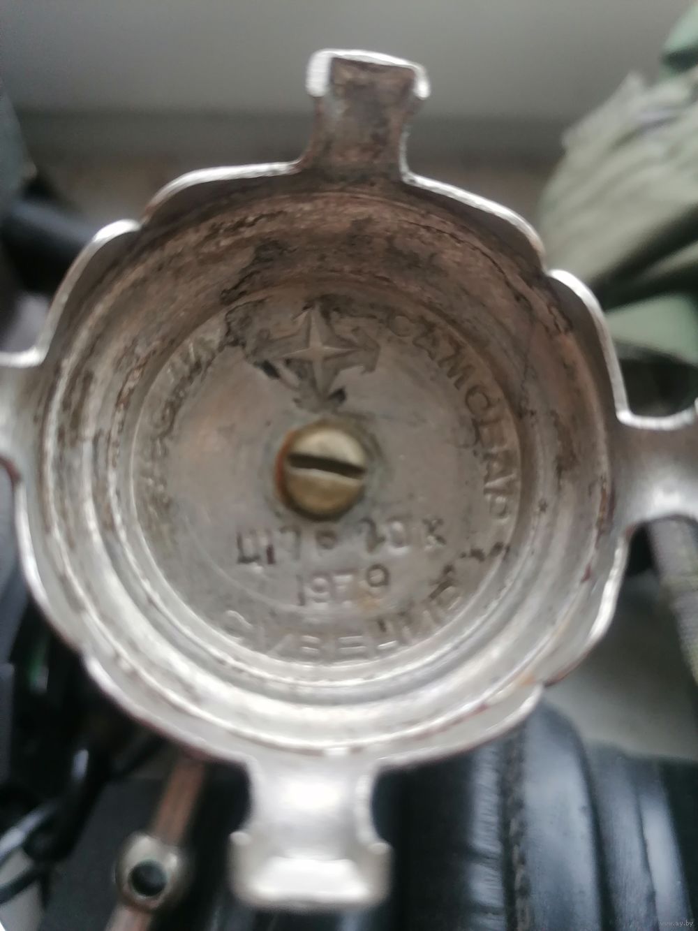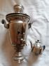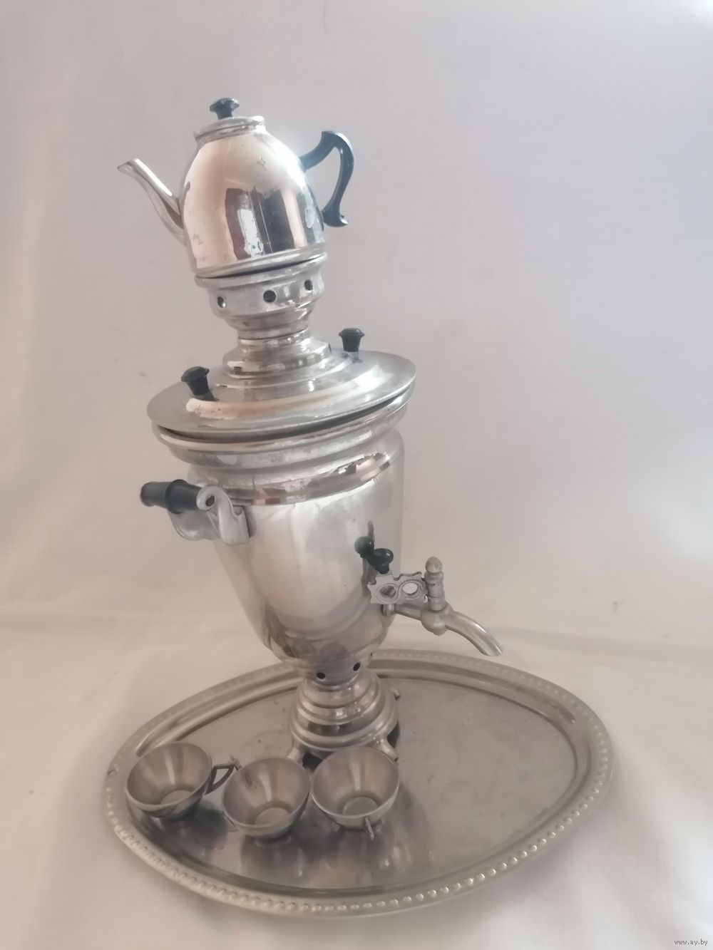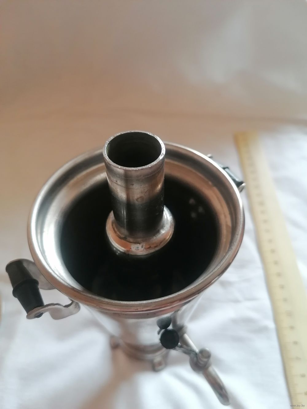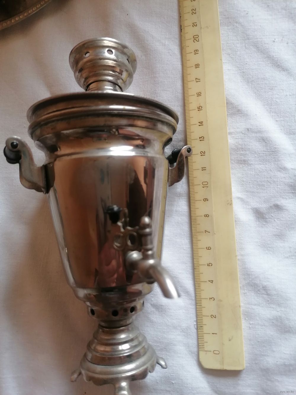 Тулово в форме рюмки с узким перехватом в верхней части. Стенка гладкая. Круг узкий, кольцеобразный. Крышка ступенчатая. Ручки составлены из парных, гладких, изогнутых кверху пластин. Присоединены к тулову с помощью рельефной накладки. Репеек круглый, плоский. Стебло крана гладкое. Ветка крана 8-образная, с короткими ответвлениями. Шейка с прямоугольными прорезями поддувала, на круглом ступенчатом основании. Поддон круглый, ступенчатей, с фигурным нижним краем. Ножки плоские, выступающие вперед. На донце клеймо: «Русский самовар, сувенир», 1976г.