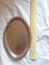 Поднос овальной формы. Бортик невысокий, слегка отогнут наружу. По борту рельефный орнамент в форме кружков. На поверхности подноса орнамент растительного характера, выполнен методом механической гравировки.