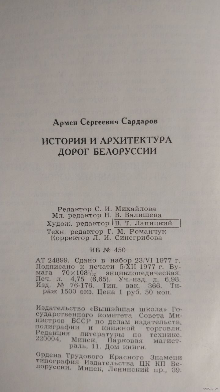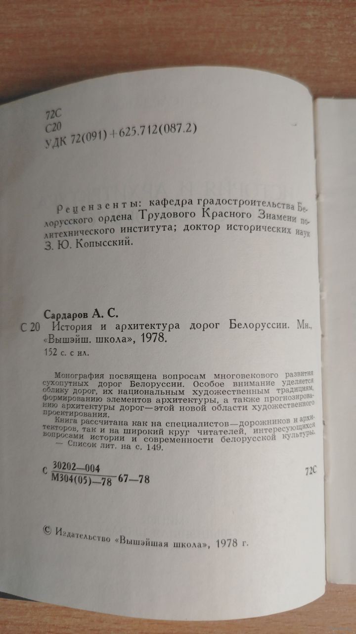 А. С. Сардаров. История и архитектура дорог Белоруссии. Минск : Вышэйшая школа, 1978 г. 152 c. Твердый переплет. Суперобложка.