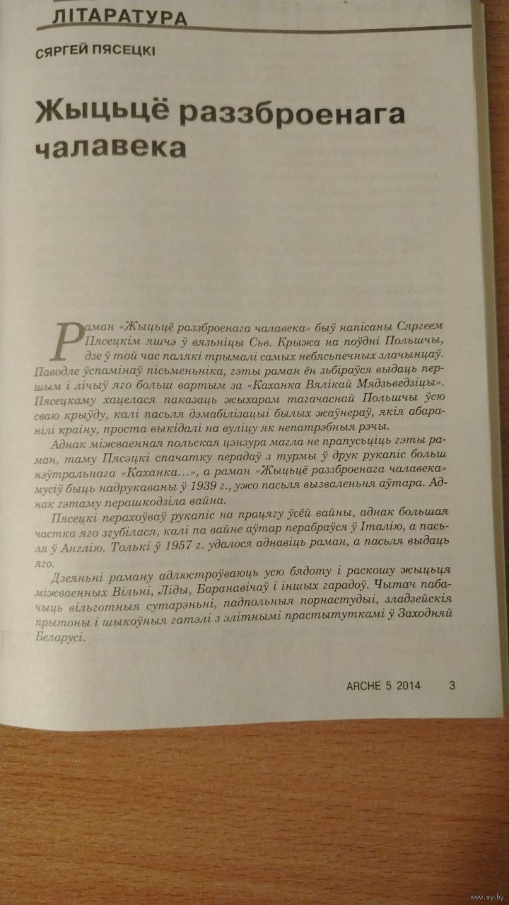 Жыцьцё раззброенага чалавека : раман / Сяргей Пясецкі ; пераклад з польскай Руслана Равякі. — Мінск : ТАА «Гайсак», 2016. — 256 с. Асноўнае дзеяньне рамана адбываецца на тэрыторыі міжваеннай Заходняй Беларусі – у Вільні, Лідзе, Баранавічах, Маладэчне, Берасці, а таксама ў заходнебеларускіх вёсках і мястэчках. Раман расказвае пра небяспечныя й поўныя інтрыг, часам крымінальныя, а часам сэксуальныя прыгоды дэмабілізаванага добраахвотніка польскага войска Міхала Лубеня. Прыехаўшы з Менску ў Вільню, ён адчувае сябе кінутым на сваволю лёсу. Пасьля доўгіх і няўдалых спробаў уладкавацца на працу Лубень выбірае працу натурніка ў падпольнай віленскай порнастудыі. Калі ж і гэтая праца перастае яго маральна задавальняць, ён становіцца ўдзельнікам крымінальнай банды, што займаецца вырабам і продажам фальшывых чэкаў амэрыканскіх банкаў. Хоць напачатку гэтая дзейнасьць прыносіць Міхалу Лубеню неверагодны даход, урэшце яна прыводзіць яго ў віленскую турму. Апісанне побыту вязьняў віленскае турмы, каларытныя вобразы заходнебеларускіх габрэяў і сялян, якія, як адмыслова падкрэслівае аўтар, гавораць сакавітай беларускай мовай – таксама адметны элемэнт гэтага твору.