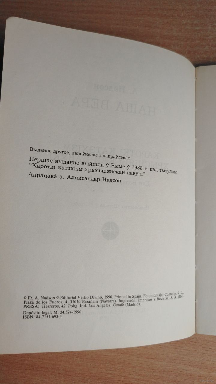 А.Надсон. Наша вера: Кароткій катэхізм хрысціянскай навукі: Для беларусаў каталікоў. 2-е выд. Б. м. : Царква ў Патрэбе, 1990 г. 65 с. Мяккая вокладка.
