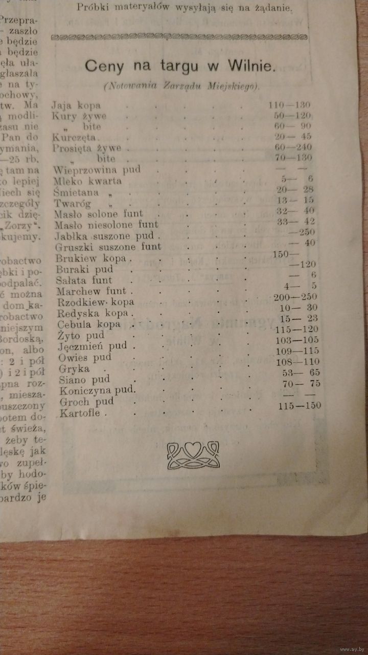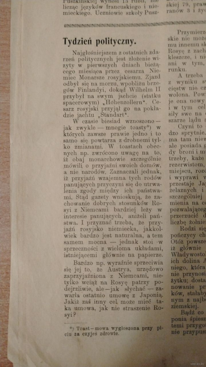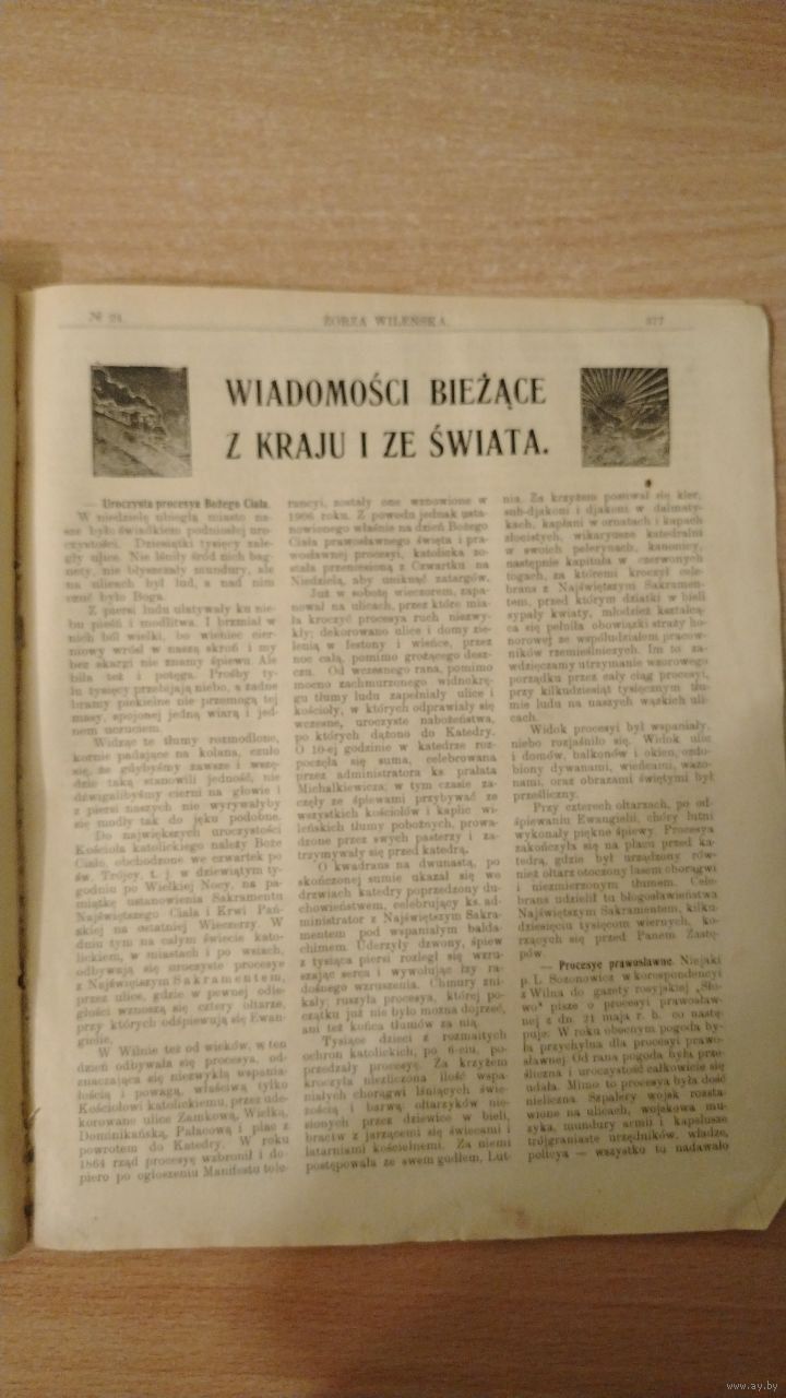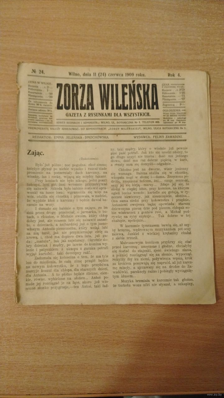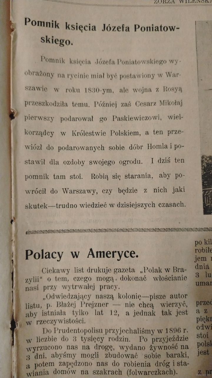 Самовывоз!!! RRR!!! В номере гравюра памятника Юзефу Понятовскому в Гомеле. Еженедельная 16-стр. газета "Zorza wilenska" (Заря Вильна) N 24 11 июня 1909 г. Почтой не высылаю.