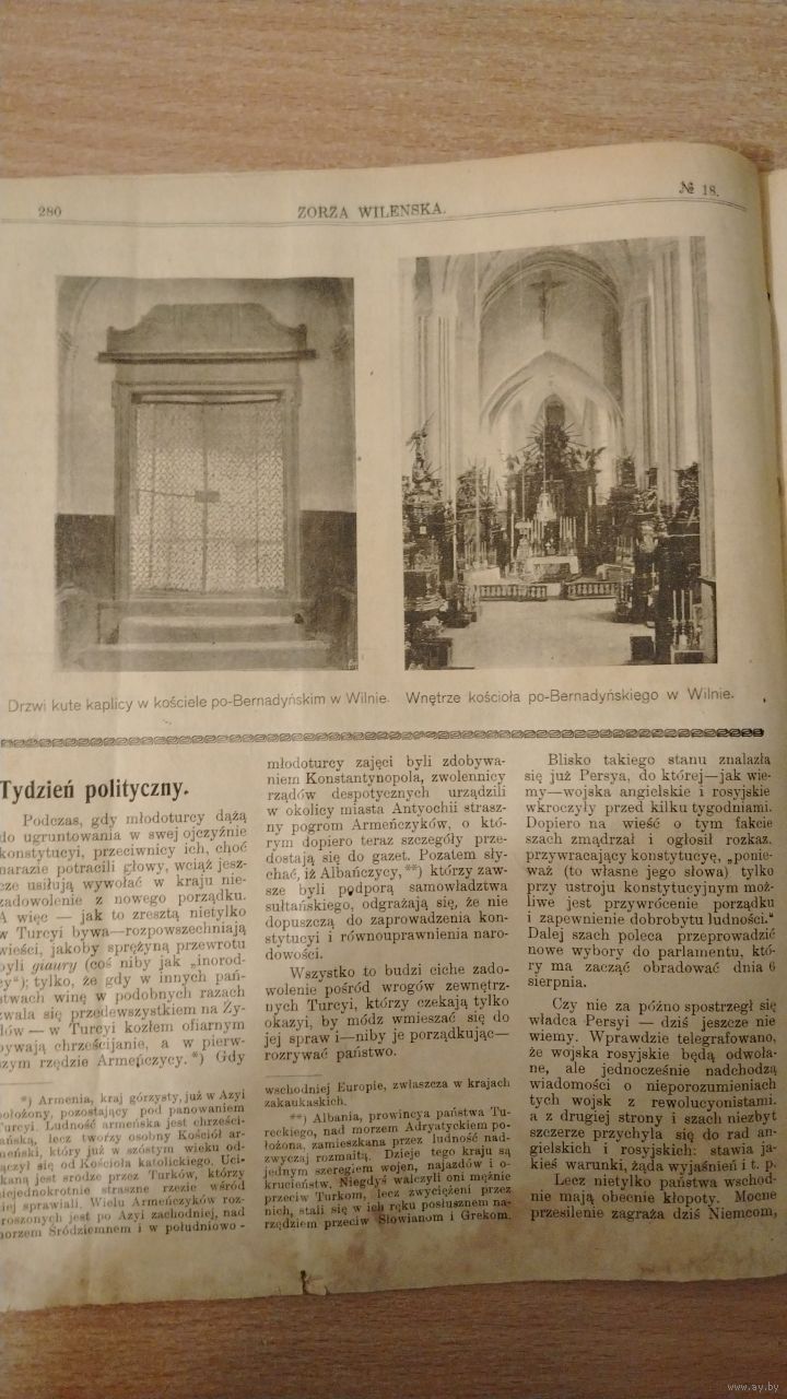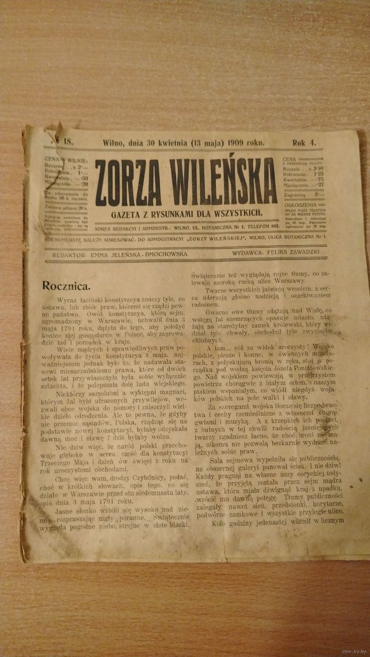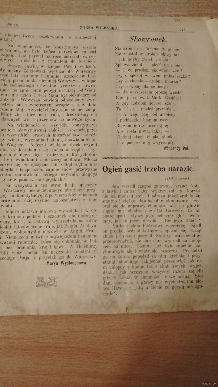 Уплыў польскай нацыянал-дэмакратыі ў беларуска-літоўскіх губернях праяўляўся праз дзейнасць звязаных з ёй грамадскіх арганізацый: "Саюз нацыянальнай моладзі", "Сокал", "Зэт" і г.д.[44]. Важнае значэнне мела таксама праца ў перыядычным друку. Найбольш значны ўплыў эндэкі мелі ў рэдакцыях штодзённай газеты "Dziennik Wileński" (з 1908 г. "Goniec codzienny", Вільня, 1906-1911) і штотыднёвай газеты "Zorza Wileńska" (Вільня, 1905-1909). Рэдактарам абодвух выданняў быў Адам Карповіч. Сярод кіраўнікоў і супрацоўнікаў газеты "Dziennik Wileński" ("Goniec codzienny") вылучаўся нацыянал-дэмакрат Юзаф Хласка. На старонках выдання прапагандавалася ідэалогія нацыянальнага эгаізму, шмат пісалася пра абарону інтарэсаў польскай нацыянальнасці ў краі, пра неабходнасць яго матэрыяльнага і культурнага прагрэсу, усеагульнай адукацыі, падвяргалася крытыцы дзейнасць рэвалюцыянераў. Пры гэтым выданне выступала супраць палітычнай аўтаноміі гістарычнай Літвы[37]. Газета "Zorza Wileńska" не вяла наўпроставай партыйнай прапаганды. Яна прапагандавала навучанне польскай мове ў дзяржаўных школах, стварэнне сельскагаспадарчых гурткоў[45][34]. ( З Вiкiпедыi ). Эма Дмахоўская (у дзявоцтве Яле́нская; 28 лютага 1864, вёска Камаровічы, Мазырскі павет, Мінская губерня, Расійская імперыя — 24 студзеня 1919, Вільня) — польскамоўная пісьменніца, беларуская фалькларыстка і этнограф. З 1908 года Эма Дмахоўская рэдагавала віленскую польскамоўную газету «Zorza Wileńska», а пасля закрыцця гэтай газеты расійскімі ўладамі — рэдагавала з 1909 года газету «Jutrzenka»...
