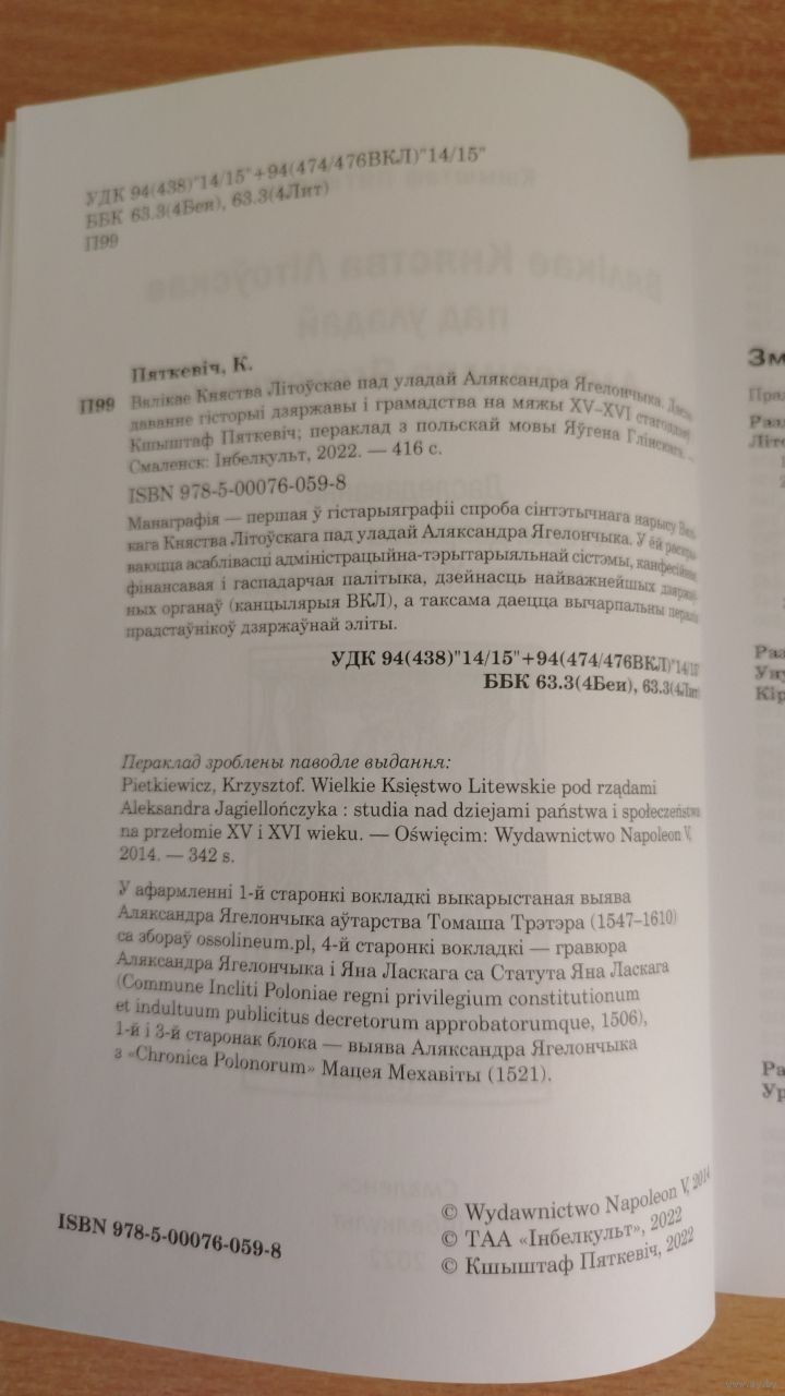 Вялікае Княства Літоўскае пад уладай Аляксандра Ягелончыка. Даследаванне гісторыі дзяржавы і грамадства на мяжы XV–XVI стагоддзяў / Кшыштаф Пяткевіч; пераклад з польскай мовы Яўгена Глінскага. — Смаленск: Інбелкульт, 2022. — 416 с.