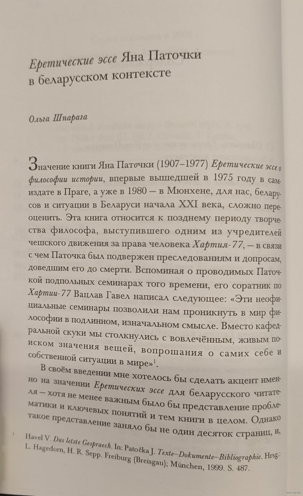 Еретические эссе о философии истории Яна Паточки относятся к позднему периоду творчества философа. В этой книге Паточка попытался показать принципиальную важность связки политики, философии и истории для понимания бытия человека. Новое звучание в книге получила также тема «Европы» — европейской истории и европейской идеи, в качестве ядра которой Паточка видит сократовскую «заботу о душе».⠀⠀