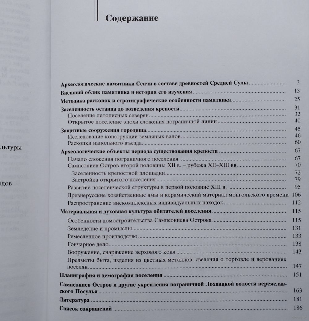 Большой энциклопедический формат. Тираж 300 экз. 192 стр. Основой монографии стали итоги полевых исследований остатков древнерусского поселения на р. Суле, на берегах которой на протяжении XI - XIII вв. сформировалась одна из наиболее устойчивых оборонительных линий Южной Руси. В работе подробно анализируются материалы многолетних раскопок памятника, позволяющие проследить основные этапы развития его поселенческой структуры --- от незначительного северного поселка до развитого фортификационного комплекса, возведенного на удобной речной переправе. Не оставлены без внимания и планиграфия Сампсониева Острова, особенности его домостроительства, приметы земледельческой и ремесленной культуры, а также опыт демографического анализа поселения.