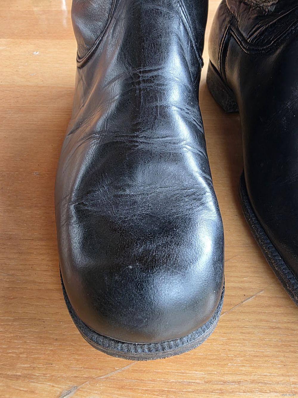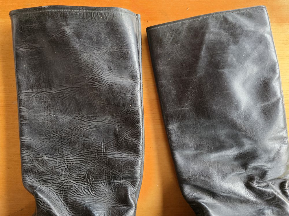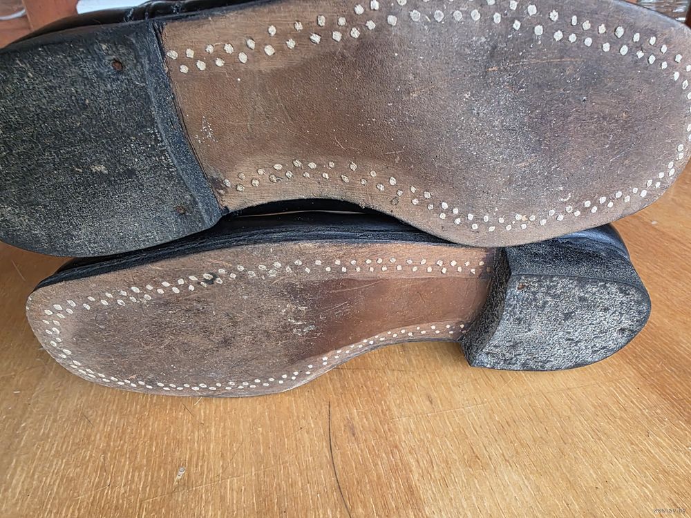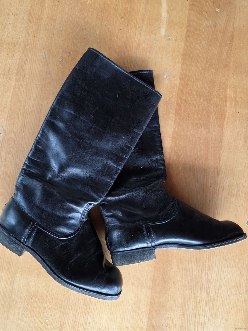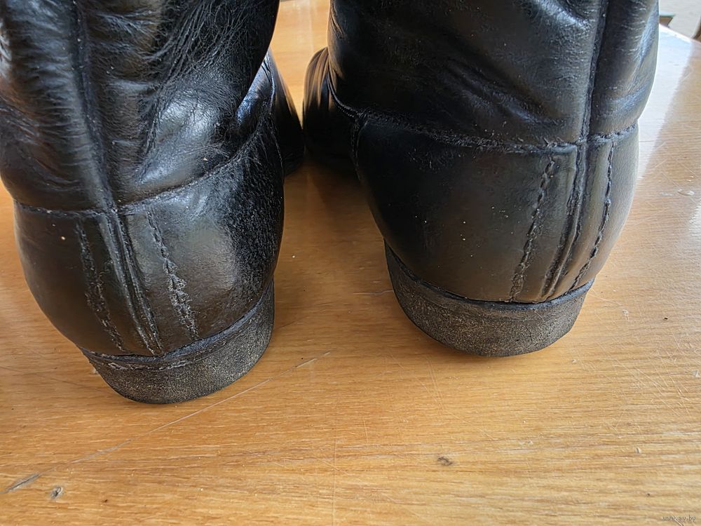 Кожа мягкая, подошва 28 см длина, гвозди-дерево. Высота 41 см, голенище по кругу около 38 см. Мало ношены. Состояние огонь !!! На подошве клеймо владельца.