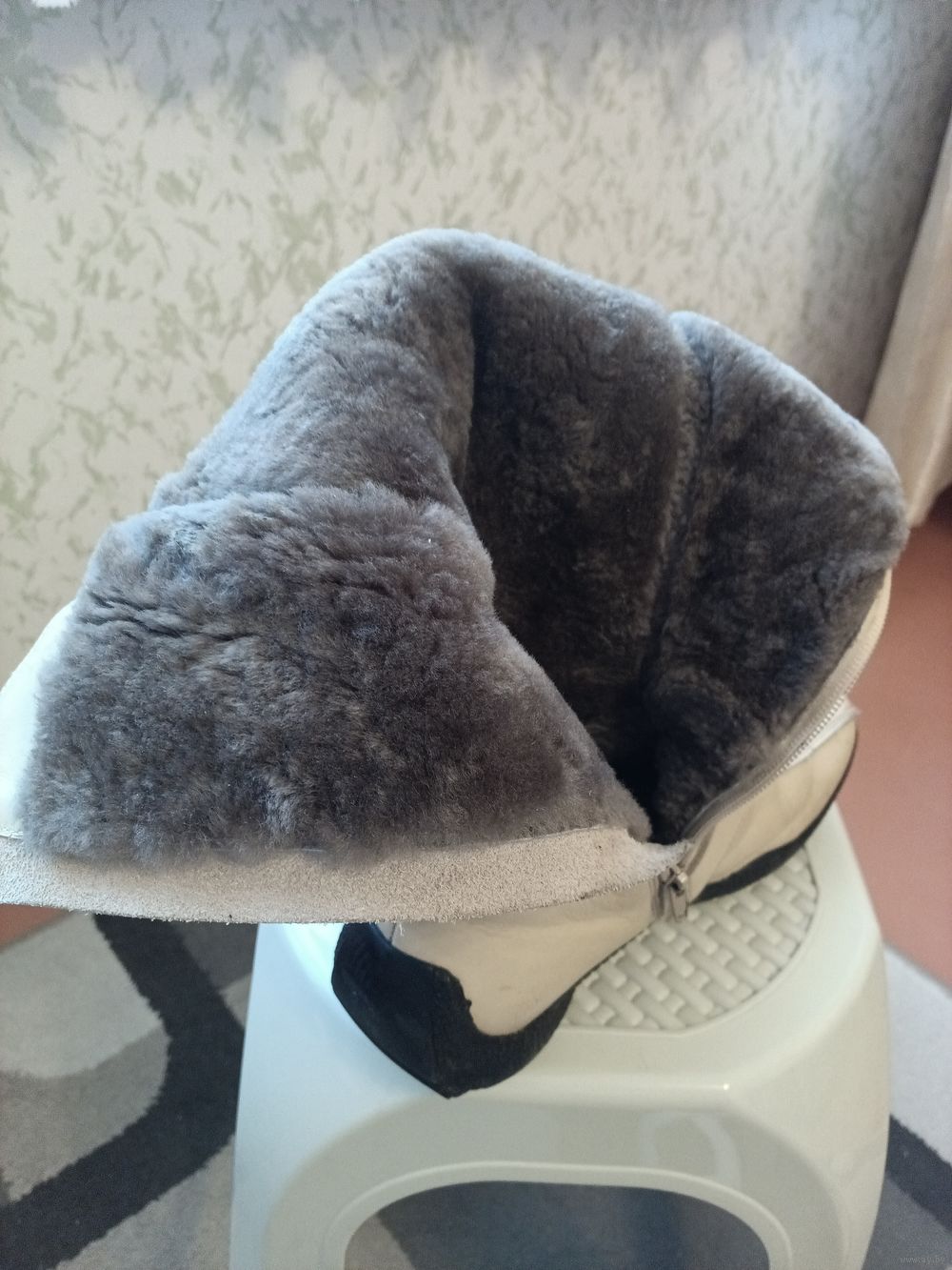 Длина стельки 25 см., натуральный мех внутри в отличном состоянии, в том числе на стельке, кремового цвета