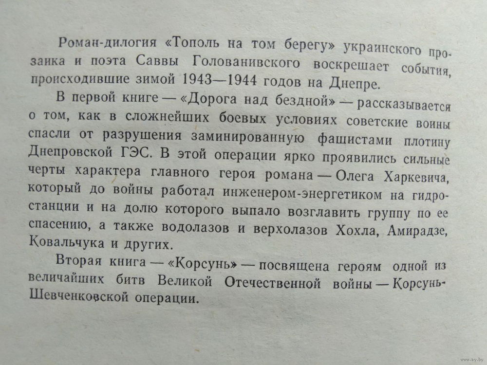Роман-дилогия «Тополь на том берегу» украинского прозаика и поэта Саввы Голованивского воскрешает события, происходившие зимой 1943 — 1944 годов на Днепре.