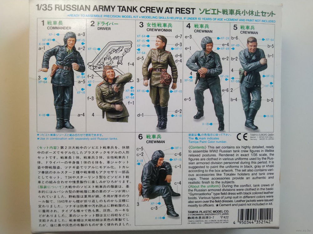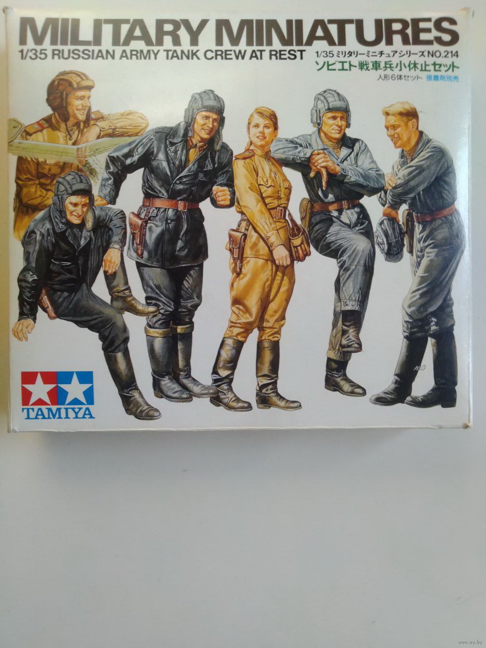 Фирма:Tamiya. Заголовок:Russian Army Tank Crew at RestЧисло:35214 (Также перечислено как 214). Масштаб:1:35. Тип: Фигура. Вышел:1997 Новая разработка. Тема:Soviet soldiers (WW2)